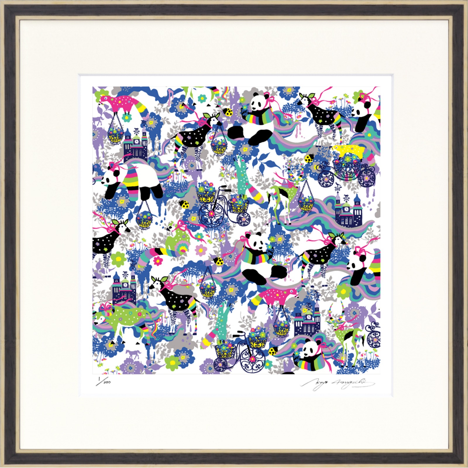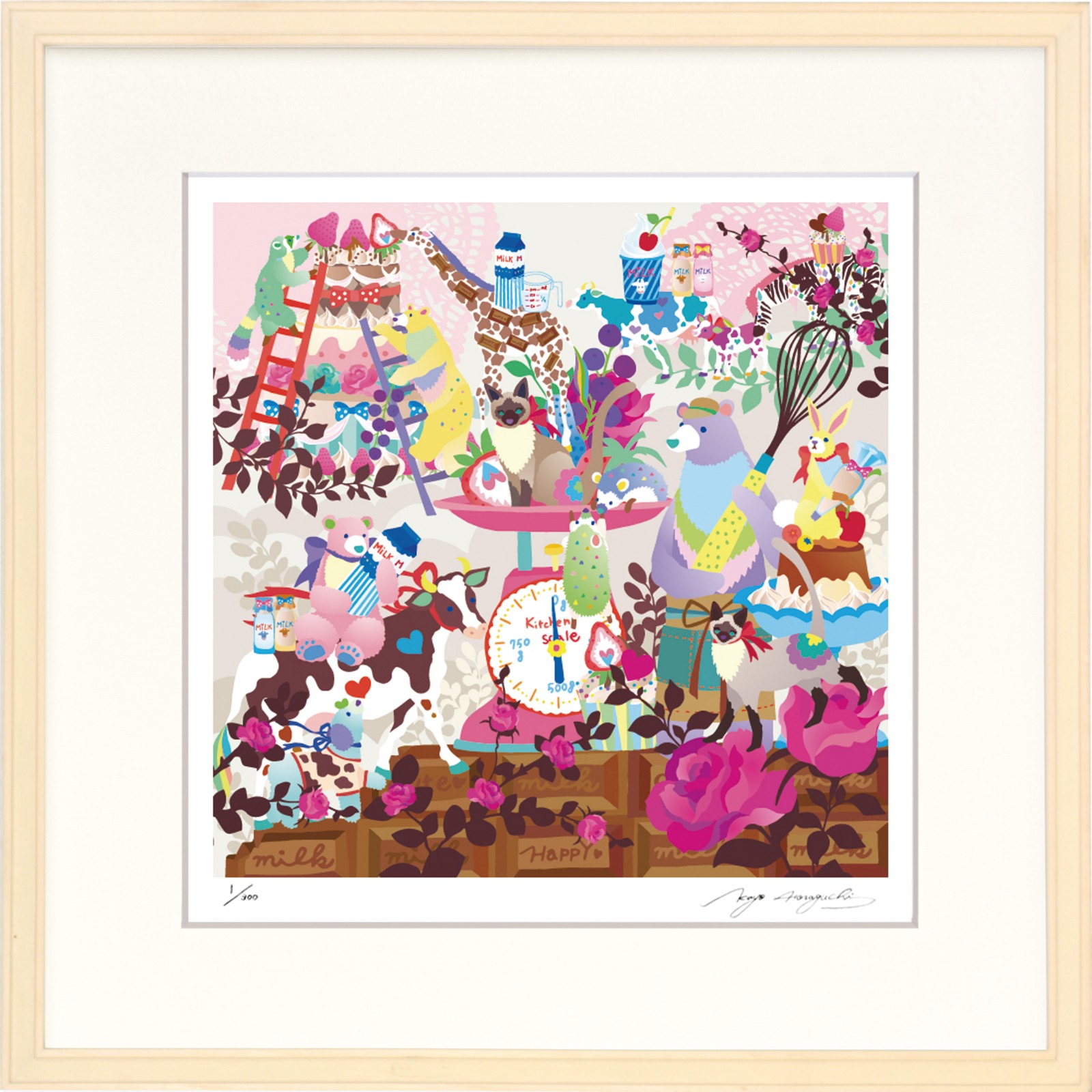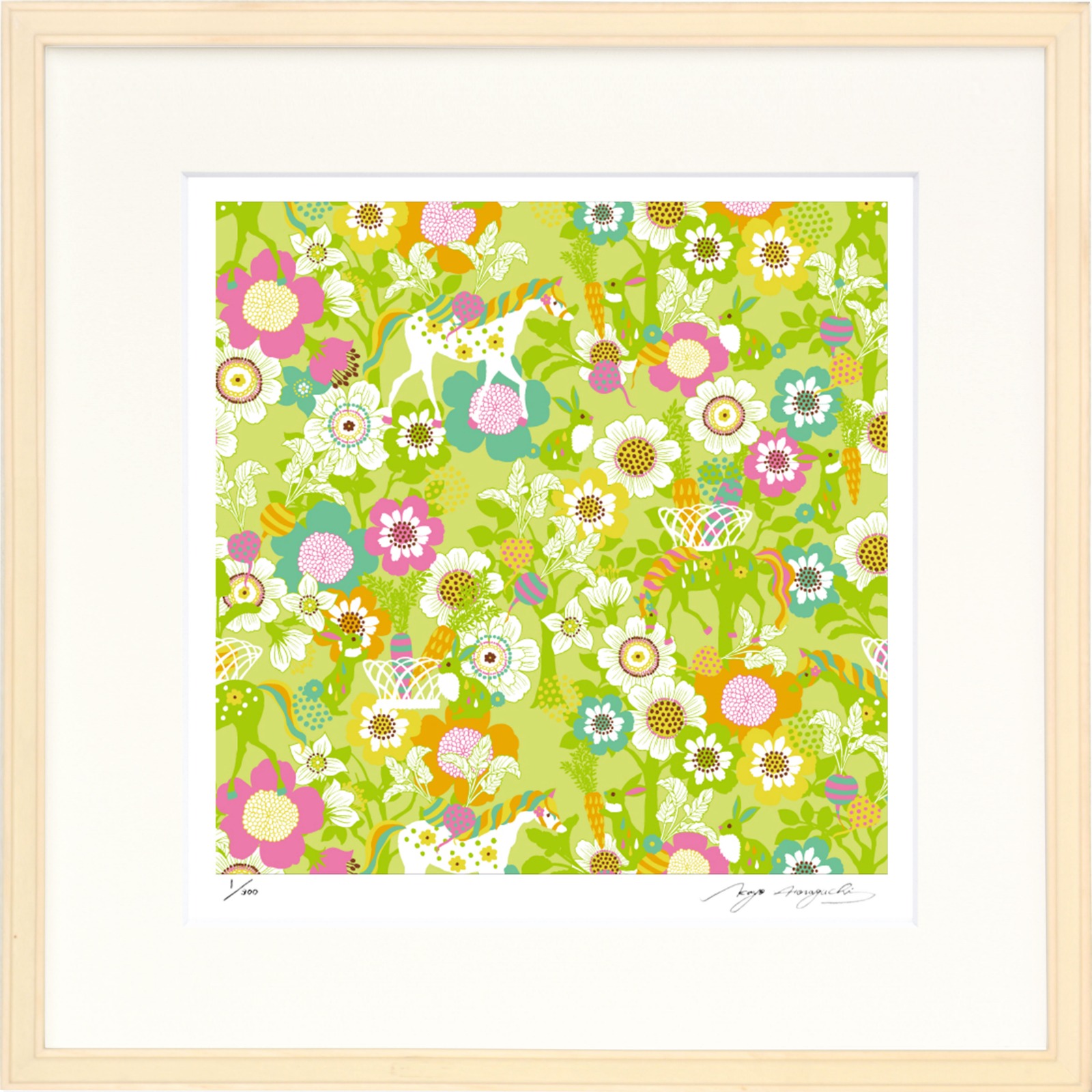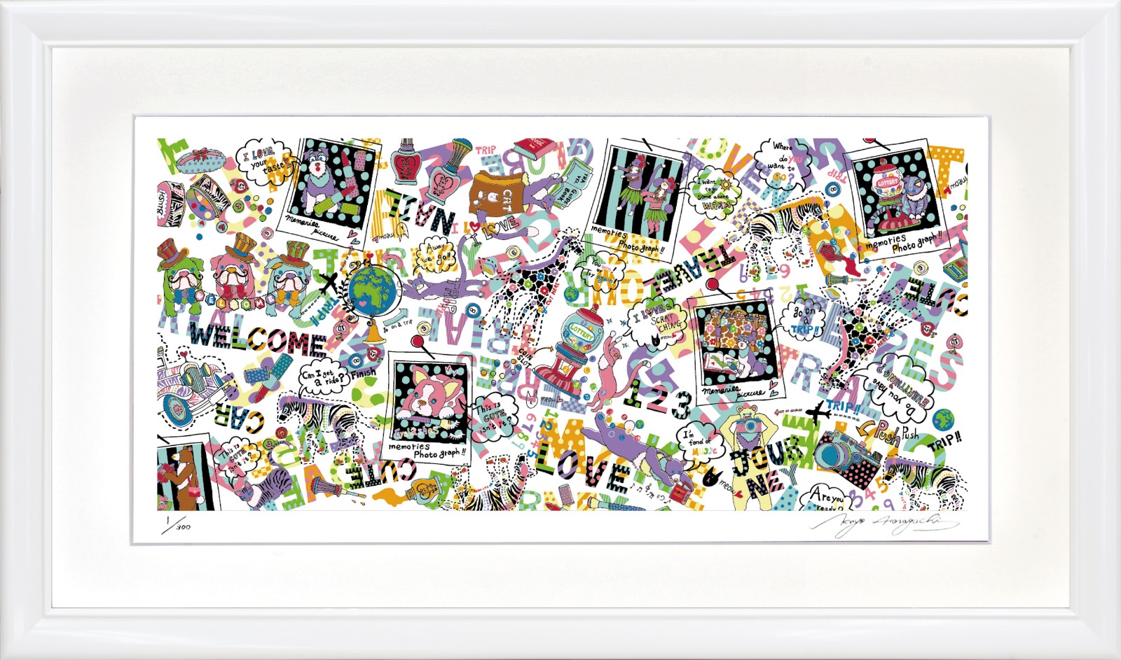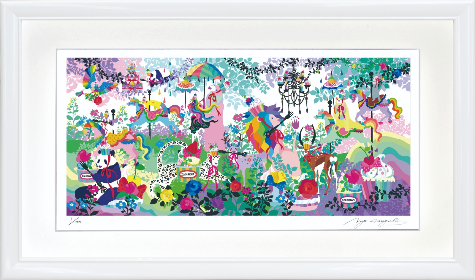 おんなのこ、植物、動物といった様々なモチーフが重なり合う鮮やかな色使いの個性的なグラフィックを得意としている。