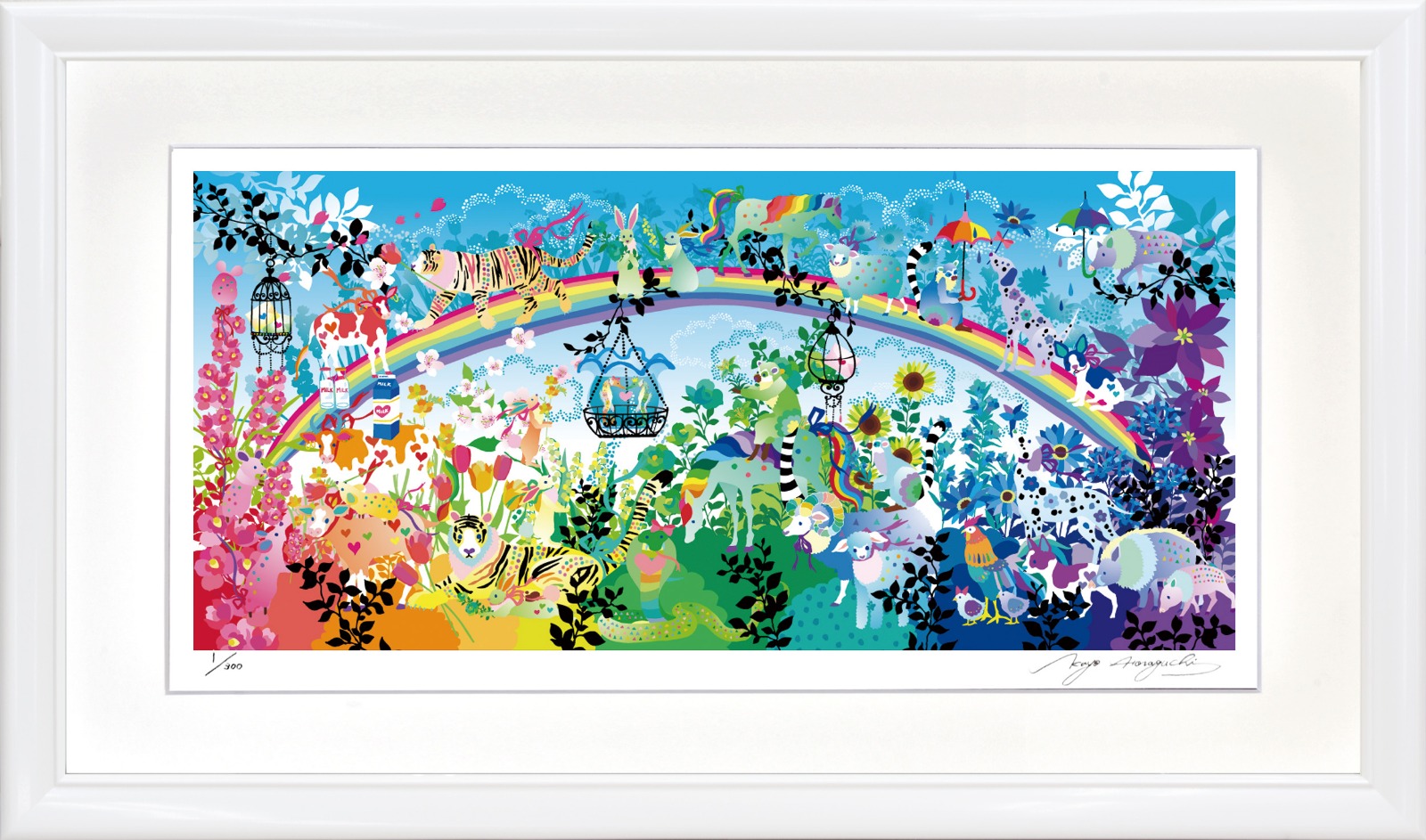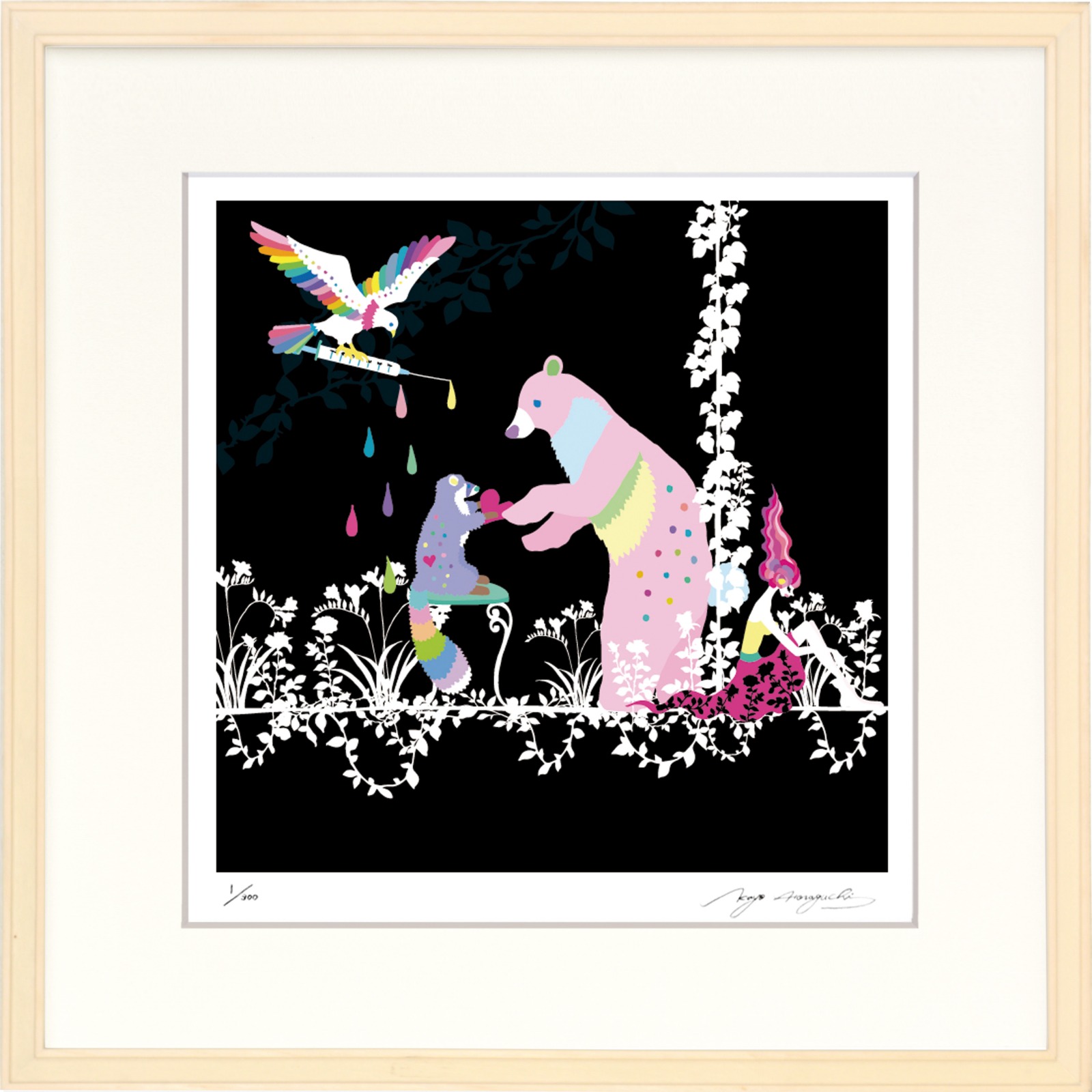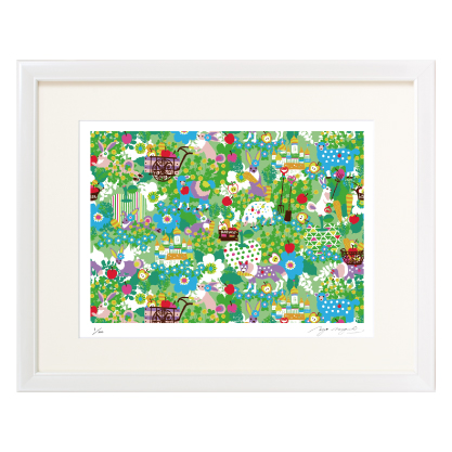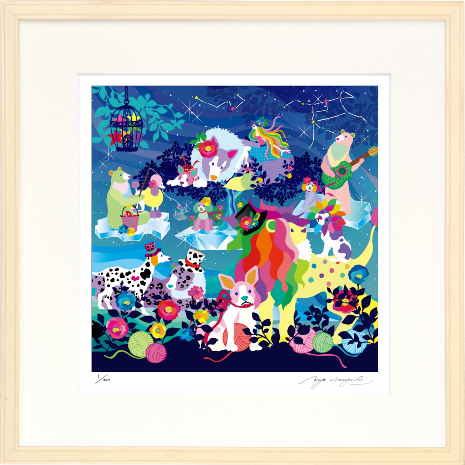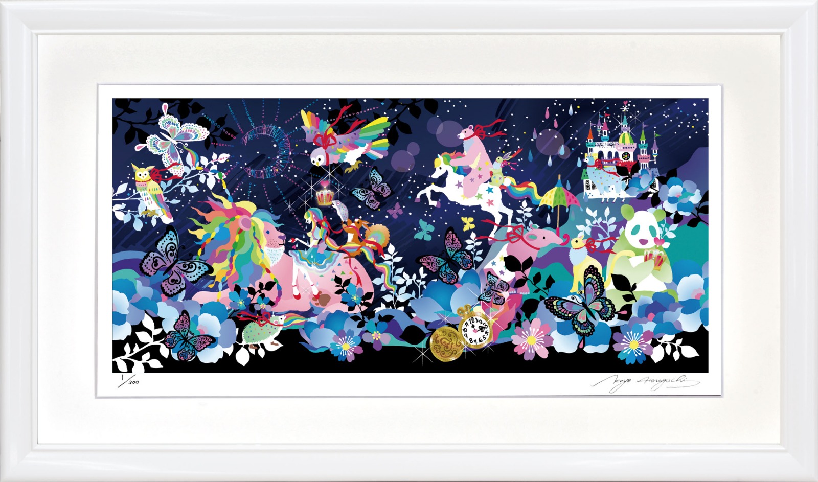 おんなのこ、植物、動物といった様々なモチーフが重なり合う鮮やかな色使いの個性的なグラフィックを得意としている。