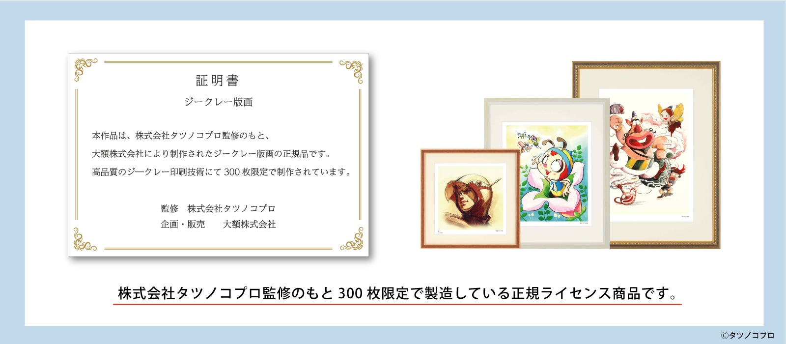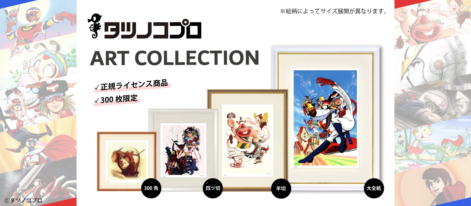 『科学忍者隊ガッチャマン』、『ハクション大魔王』、『タイムボカンシリーズヤッターマン』など数々の名作アニメを生み出している株式会社タツノコプロの人気作品が300枚限定のジクレー版画として登場!※作品により絵柄の種類やサイズ展開が異なります。Ⓒタツノコプロ