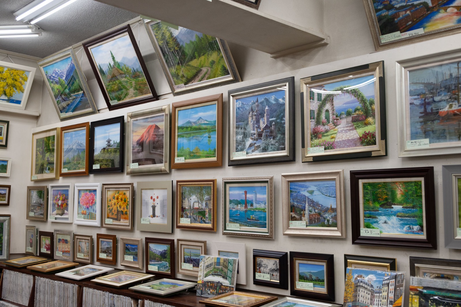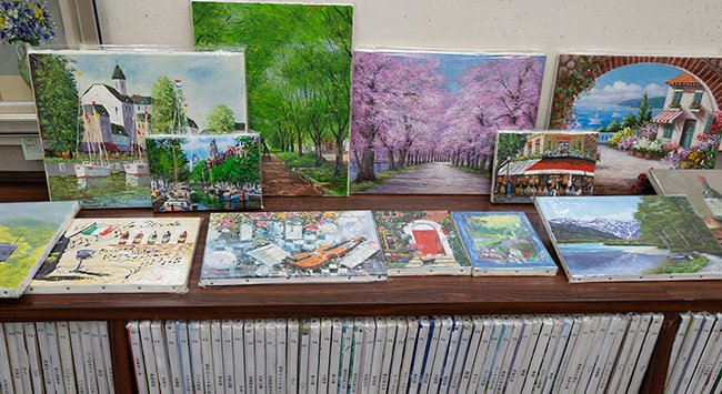 額付き絵画は約430点、額付き油絵は約160点展示しておりますので、お好みの絵画をゆっくりとお選びいただけます。