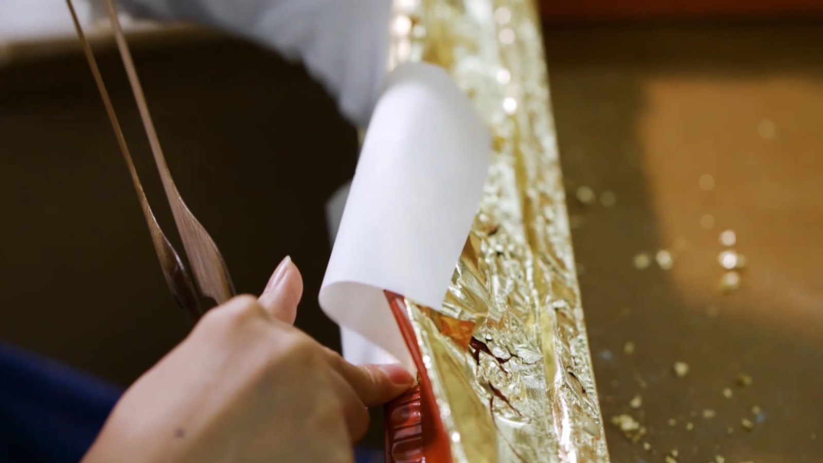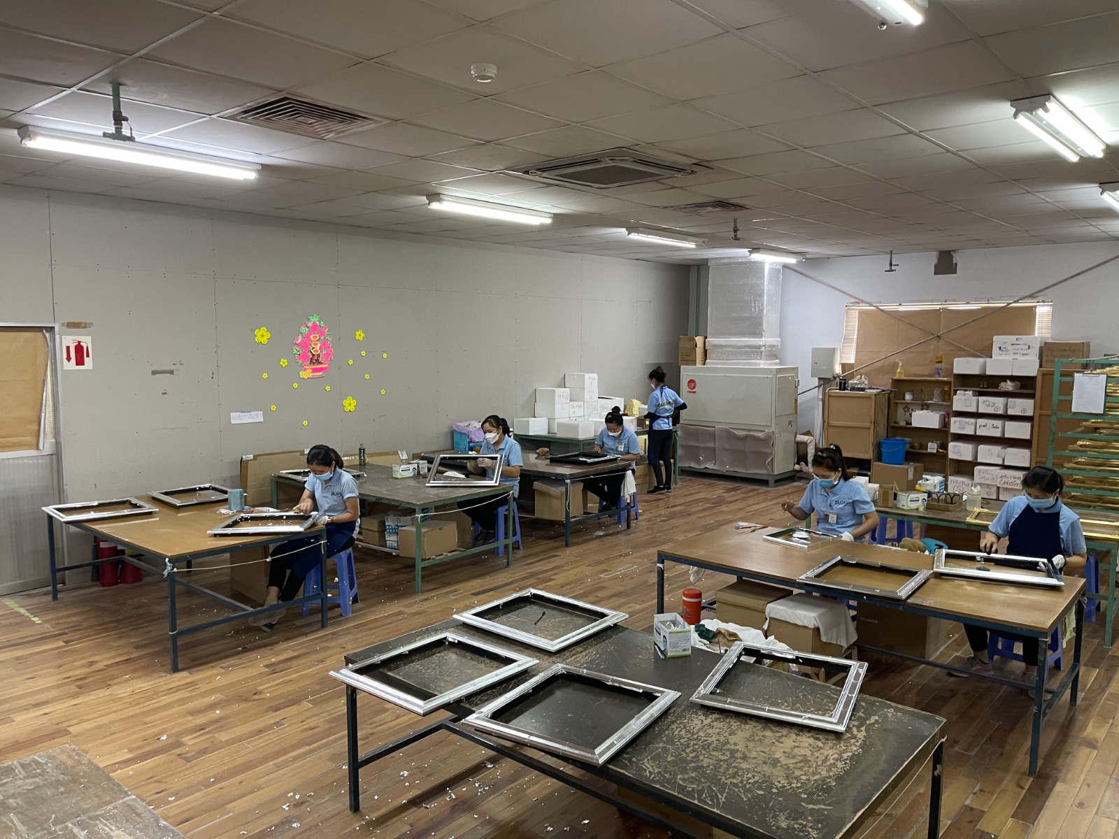 箔仕上げの額縁を製造しているベトナム工場では、箔貼りのスタッフが複数人在籍しています。