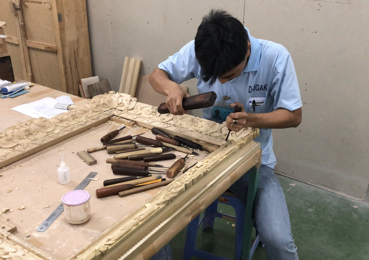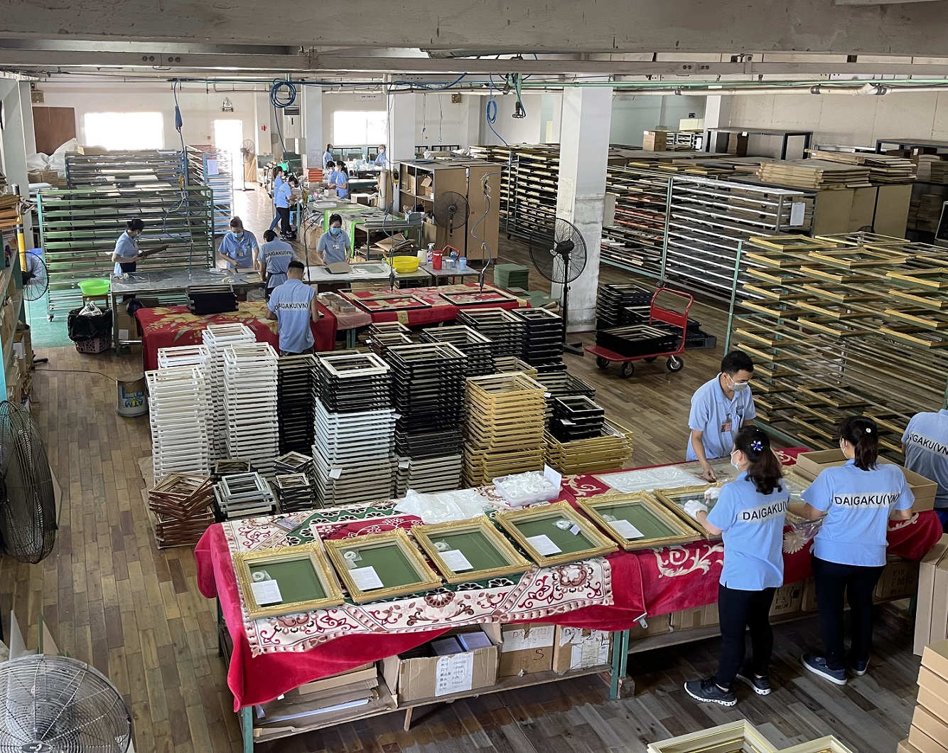 ベトナム工場では、金箔を使用した高級額縁から、量産型のコストパフォーマンス重視の額縁まで、