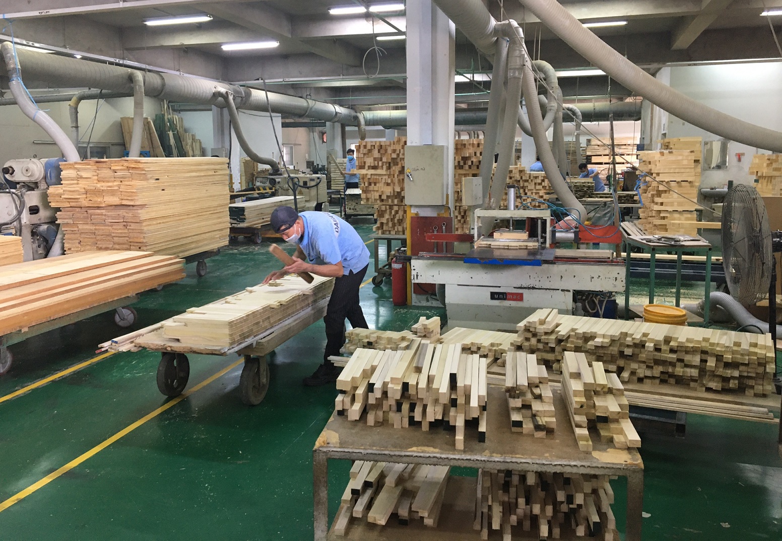 ベトナム工場では材木のヒビ割れや傷、節などの箇所を取り除き、状態の良い箇所を選別しています。