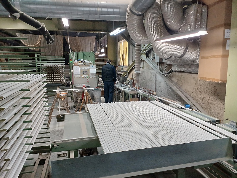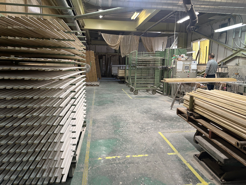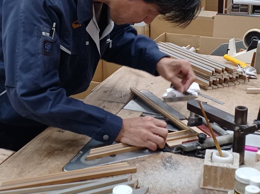塗装された棹材を、それぞれの額縁サイズに応じて丁寧にカットします。