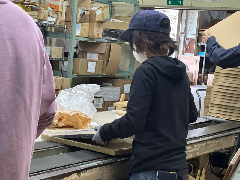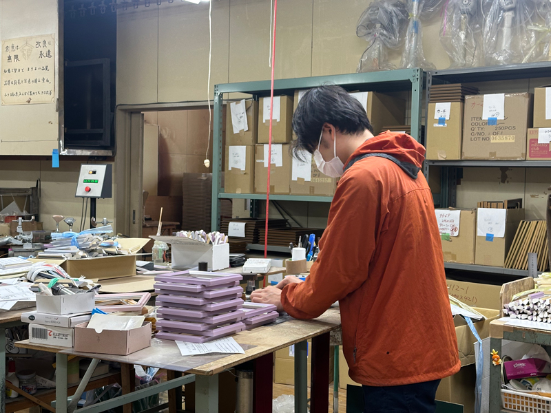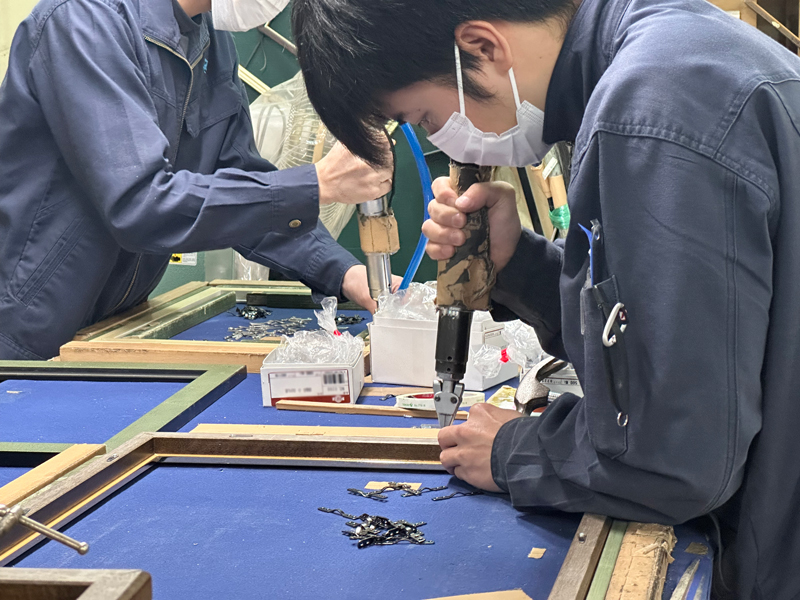 組みあがった額縁に、裏面の吊り金具や各種パーツ、中に入れるアクリル板、裏板などを手作業で取り付けます。額縁の種類に応じてパーツや中に入れるモノが異なるため、一点ずつ丁寧に仕様書を確認しながら対応。