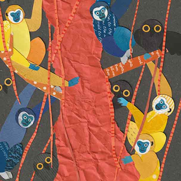 主に紙を使ってコラージュや切り絵などの手法を用いてデザインし、