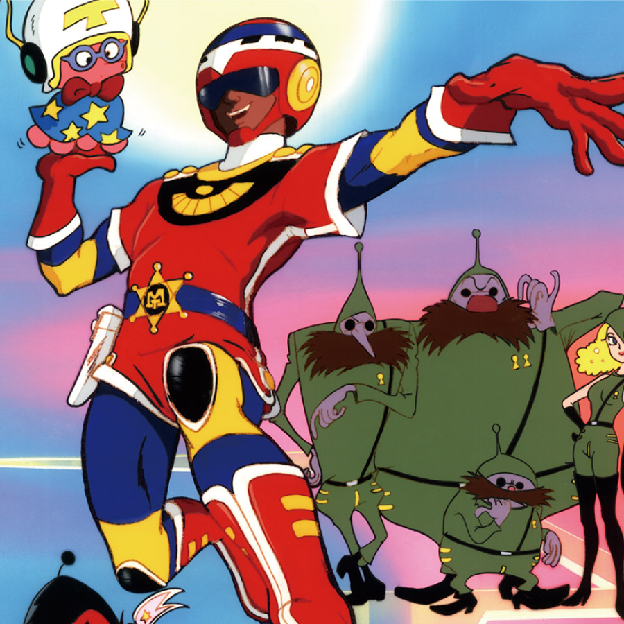300枚限定!タツノコプロ人気アニメ作品のジクレー版画。サイズ:サイズ:四ツ切(外寸446x371mm)フレーム品番:5871フレーム材質:木製フレームカラー:ホワイト表面素材:UVカットアクリル※ヒモはあらかじめ取り付けられています。『とんでも戦士ムテキング』(1980年)タコ星の保安官助手としてクロダコブラザーズを追って地球にやってきたタコローが、地球人の少年・遊木リンと協力し奇想天外な犯罪を取り締まるヒーローギャグアニメ。