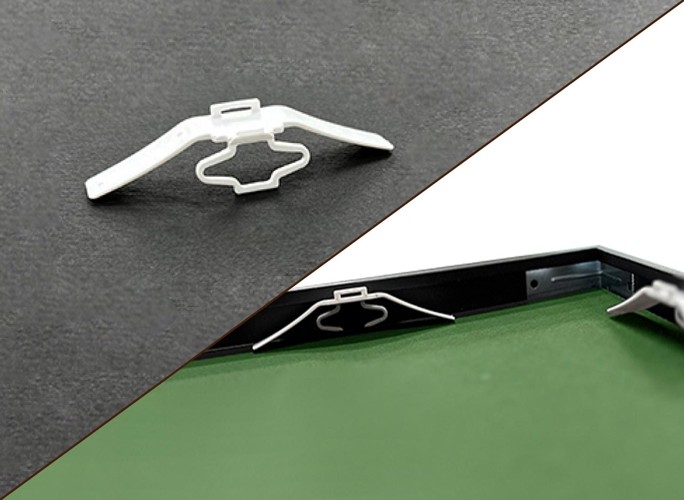 今回開発した専用の留め具はプラスチック製の板バネ式と止め具で、
